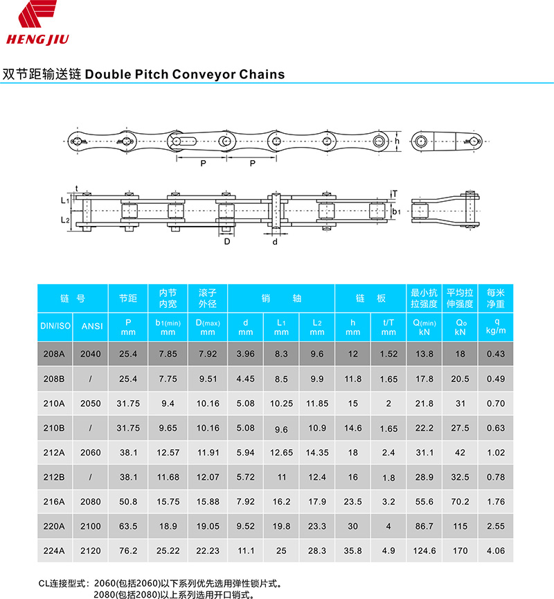 双节距滚子链是由短节距滚子链派生出来的,它的节距是后者的一倍,其它结构形式与零件尺寸相同。与短节距精密滚子链相比,它是一种轻型链条,适用于传递功率小,速度较低,传动中心距离更长的场合。