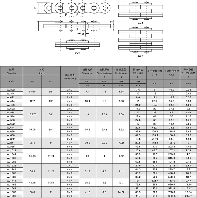 AL系列板式链的零件源于ANSI滚子链标准,链板的外形尺寸和销轴直径等同于同节距滚子链的外链板和销轴,是一种轻系列板式链。适于直线往返传动结构。