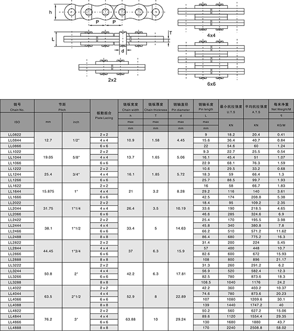LL系列板式链的零件源于BS滚子链标准,链板的外形尺寸和销轴直径等同于同节距滚子链的外链板和销轴,是一种轻系列板式链。适于直线往返传动结构。